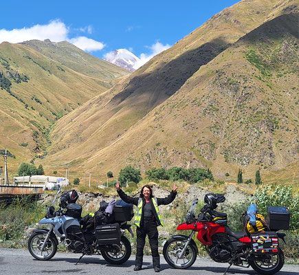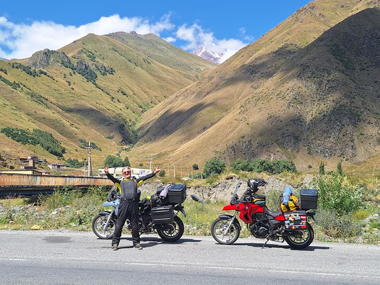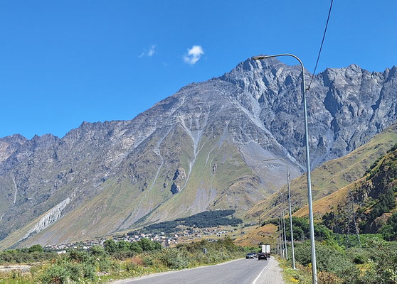 Über diese Fragen zerbrechen wir uns nicht länger den Kopf und passieren Stepanzminda, die kleine Stadt am Fuße des Kasbegs zügig, aber halt!... Der Kasbeg mit seinen 5054m zeigt sich einmal nicht Wolken verhangen, sondern zeigt seinen Schnee bedeckten Gipfel. Ihn anzusehen, versetzt uns einfach nur ins Staunen!